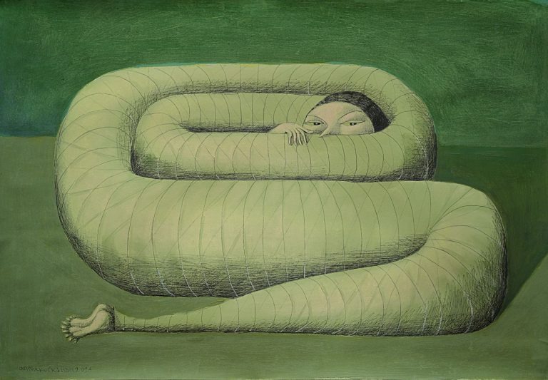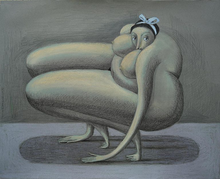 At first glance, Kurkdjian’s paintings appear sober, yet they convey a powerful message, displaying stylised beings contorted into tortured and unsettling postures. Sometimes these grotesque figures fixate on the beholder, with a numb eye and vaulted shoulders, as if harassed or lost. The monstrous subjects of these works are intended to be dissected and analysed, producing poignant images with a confrontational and potent impact on their observer. Breathing tragedy, these monumental canvases interrogate life, and compel the viewer to contemplate the process of creation.