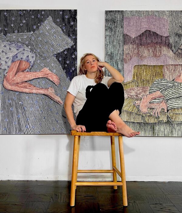 Brittany Miller’s paintings borrow visual language from Christian art history, incorporating archetypes of the martyr, savior, and saint. In her work, figures are encountering the supernatural–levitations, messages from elsewhere, and visits from otherworldly beings, while the vibrational quality of her line-work encourages the viewer to have a transcendental experience of their own.