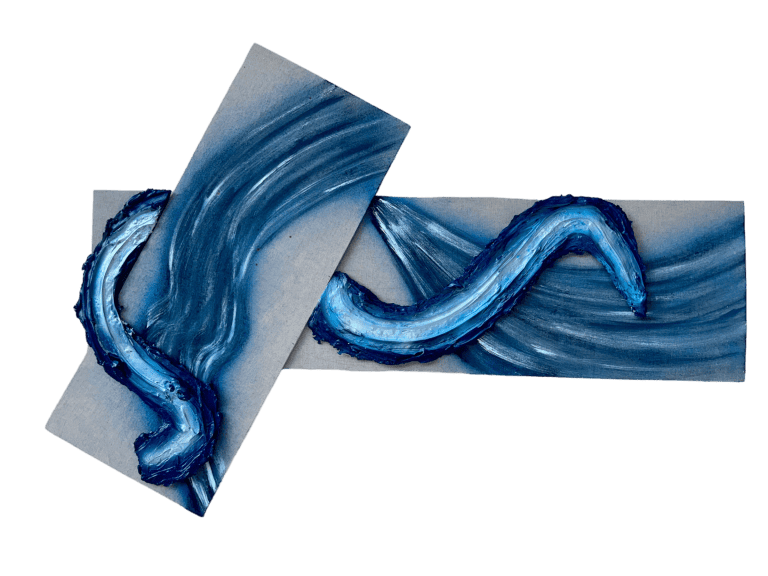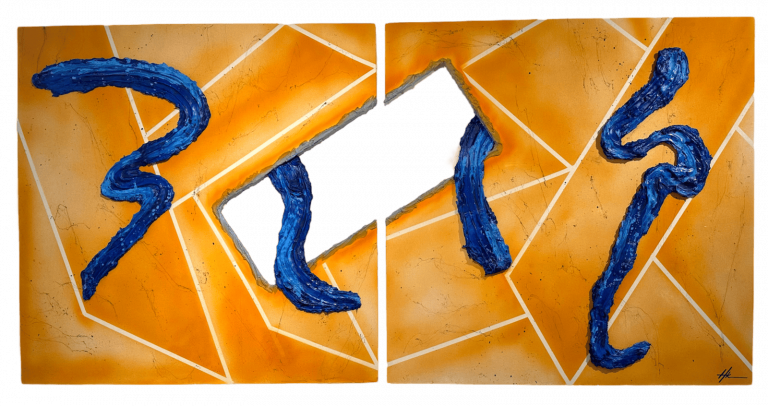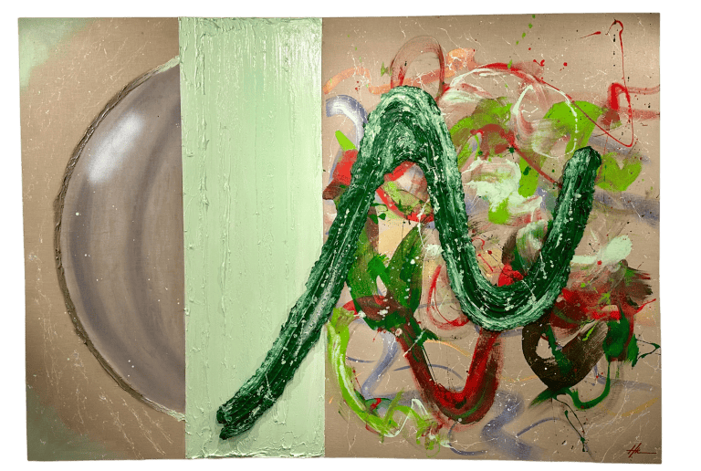 In her work, Halise mainly employs two distinct elements: cubic structures and fluid brushwork. The choice to incorporate cubic forms, whether as drawn representations or three-dimensional installations, is deliberate. These structures to her, symbolize the diverse perspectives each individual holds. By manipulating these forms, she seeks to evoke a sense of multiplicity, inviting viewers to explore the rich tapestry of human perception. The occasional addition of three-dimensional elements adds a physical dimension to the exploration of viewpoints, aiming to offer the viewers an immersive experience that mirrors the layers of human perception. Navigating the canvas, she blends perspectives with her emotive brushstrokes, transferring universal human feelings onto the canvas through her very own emotions. She applies her mixed media technique to create three-dimensional abstract forms, which to her, serve as a bridge between elements. Finally, she gets to step back and observe everything come together and create harmony on a linen-covered plywood.