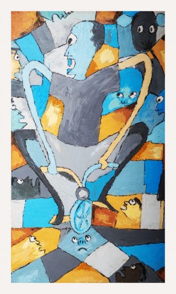 His painting style borrows from the toys of his childhood. He paints his figures with open mouths and big open eyes like kids observing the world around them: with wonder.