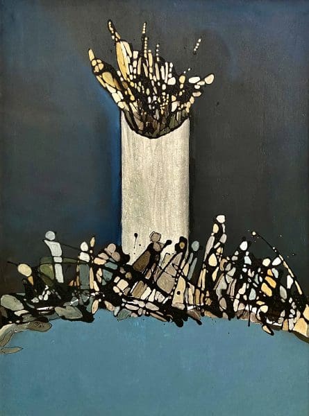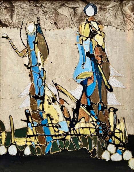 Nadira Azzouz (1927 – 2020) started painting from the age of six, later studying art at the School of Domestic Fine Arts in Baghdad (1944-49). This was followed with further studies at the Central School of Art in London (1957-60) where she achieved a BA in Painting. Like most Iraqi artists of her generation who had similarly studied abroad, her work is informed by the canon of 20th century international art yet at the same time displays its own distinctive, Iraqi, identity as found in Sumerian and Assyrian sculptures, medieval Arab manuscript illumination and the folk motifs of handicrafts and rugs, as well as local popular themes.