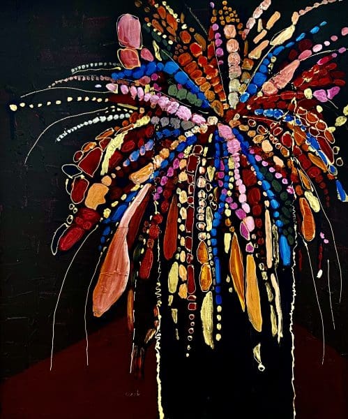 What sets Nadira apart from her artistic peers, however, is the femininity of touch in her work. The Iraqi novelist, critic and artist, Jabra Ibrahim Jabra, wrote in 1983, ‘There is something peculiarly feminine … in her choice of colour and composition as well, explicable perhaps in the context of an Iraqi woman’s passions. Things akin to burning coals suddenly glow and let off sparks through a brazier full of ashes’. ‘For her, painting has often been a communication with inner visions, inner eruptions to which no figure or word could do justice, hence her emphasis and resourceful play on colour. In her recent work one can see her striving after a more lyrical, more diaphanous effect, suggestive of technical mastery’.