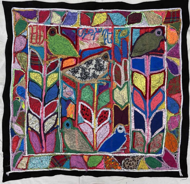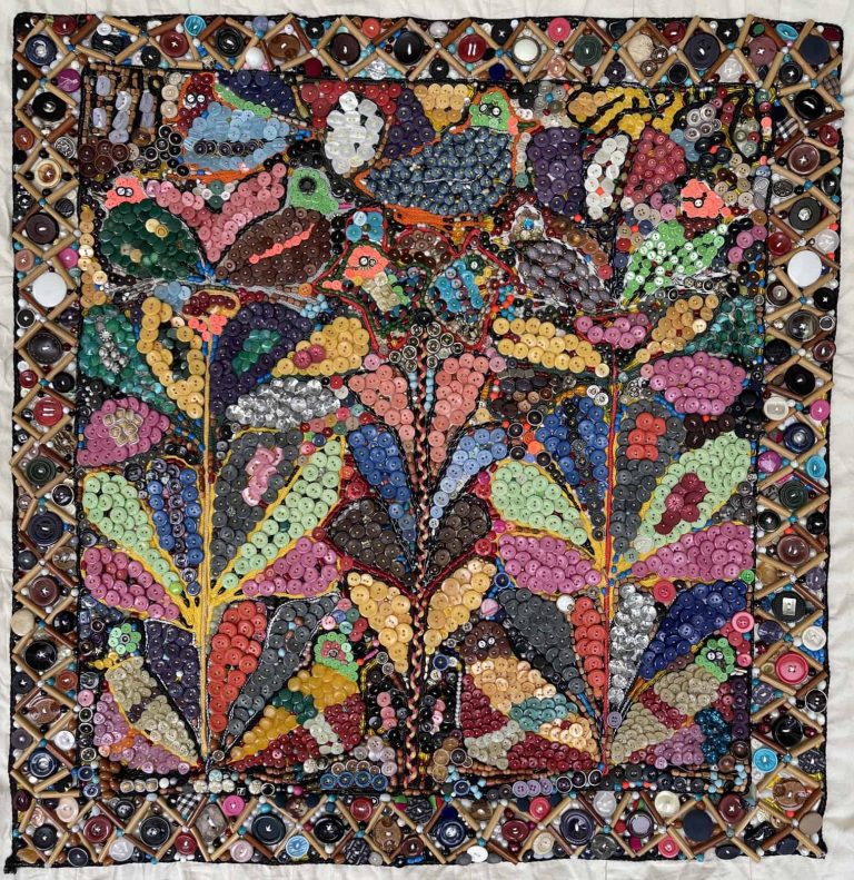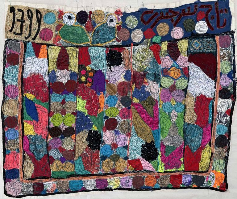 Tajsar Jafari (b. 1955, Ganjgah village in Ardabil, Iran) got married when she was seventeen years old and moved to Bandar-e Anzali. It took her 50 years to discover her artistic talent. She used to embroider and weave carpets and her artworks are formed in line with rug weaving.