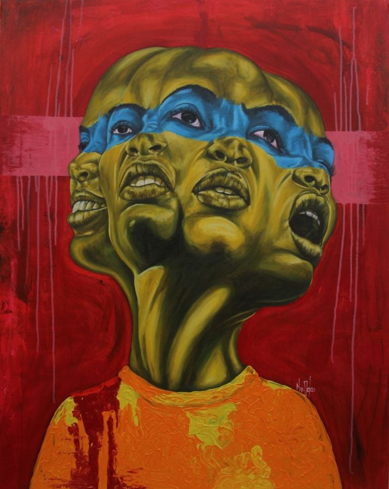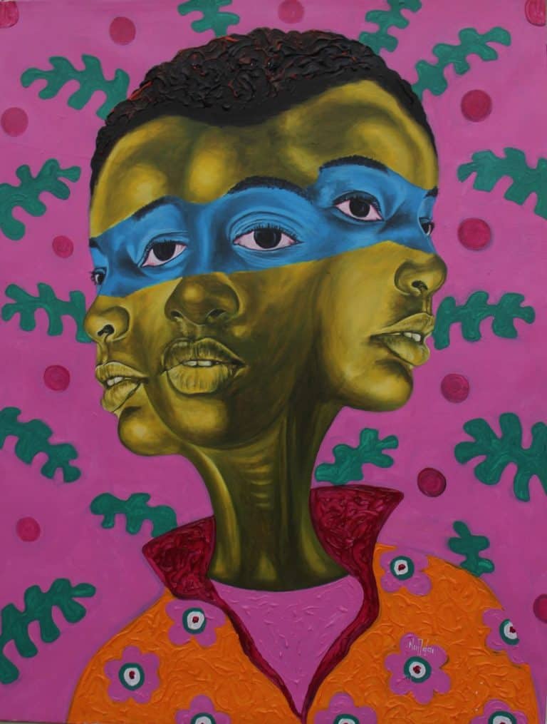 Theophilus Tetteh (b.1991) lives and works in Accra, Ghana. He studied Graphic Design and Painting at Marimus Art School, developing an expressionist and experimental approach. Tetteh’s practice synthesises the mechanics of the man-made environment with the natural order of the world. His work has been shown in numerous solo and group exhibitions across Ghana, as well as internationally at the Investec Cape Town Art Fair (2021) and in London at Mayer Brown x Artiq and the Coningsby Gallery (2021).