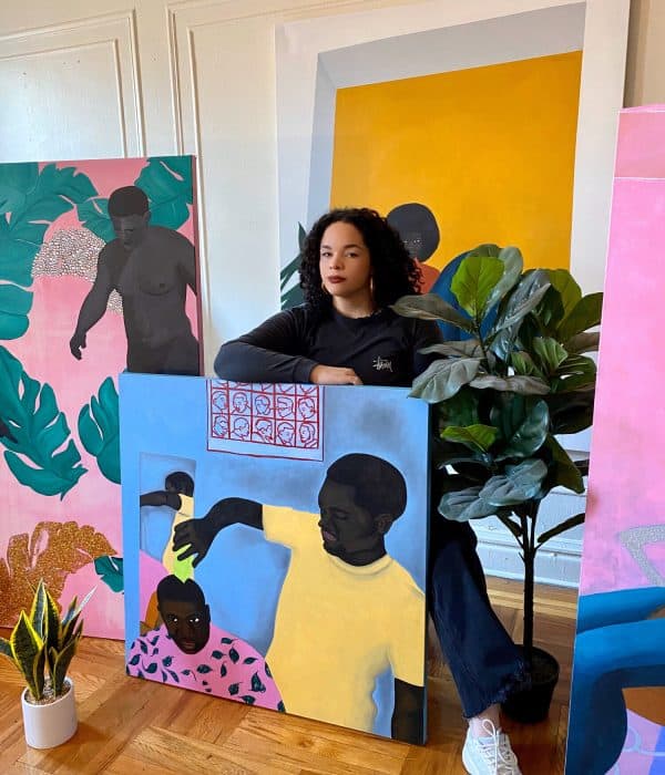 Alfonseca’s approach to artmaking is catalyzed by her desire to tussle with W.E.B. DuBois’ philosophy of “double consciousness” in order to illustrate that containing multitudes is part of what makes Black and Brown communities and their experiences unique. While analyzing questions of identity and race, Alfonseca depicts subjects that are strong, graceful, and exuding agency in a world that wants to deny their existence. Her work honors the humanity of the Black and Afro-Latinx experience in a way that is declarative and reassuring. When you consider a history where Black and Brown bodies are constantly on guard, Alfonseca’s work serves as a safe space teeming with beauty and joy.