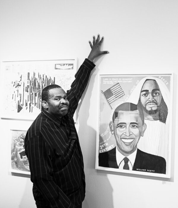 A self-taught artist, William Scott’s practice imagines alternative realities that stem from a fundamental belief in the potential for positive human transformation. While deeply rooted in personal history, Scott’s paintings address wider questions of citizenship, community, and cultural memory. His portrait series of predominantly Black figures encompasses actors, musicians, politicians, and civil rights leaders, as well as self-portraits, family members, and women from the Baptist church he has attended since childhood.