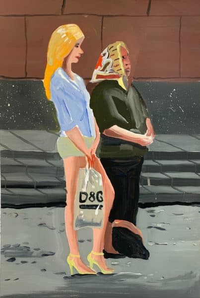 The use of irony does not trivialize socio-political criticism. His dense painting produces images that are conceived as a collage in which the typographical elements coexist with an intense revision of the great classical paintings, where the void of no-paint planes dissipates from the image.