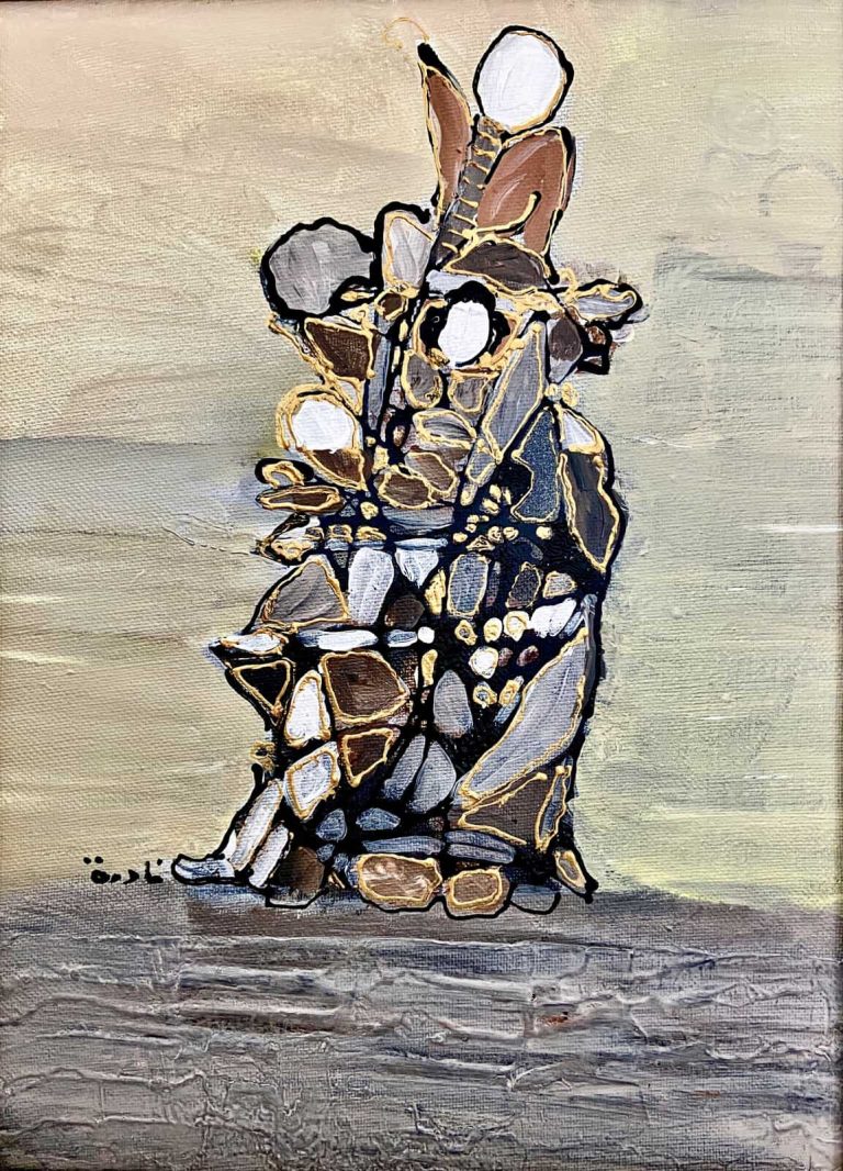 Azzouz actively progressed her artistic training further by studying Still Life and Freehand at Cambridge, before moving to Beirut to raise her children. Like many Iraqi artists of her generation who had studied abroad, often in the West, Azzouz’s artistic practice is informed by the canon of 20th century international modernism. Simultaneously, Azzouz’s oeuvre carries a distinctively Iraqi identity, as seen in the sculpture of ancient civilisations, as well as medieval Arab illuminated manuscripts and the folk motifs of handicrafts, rugs, and textiles.