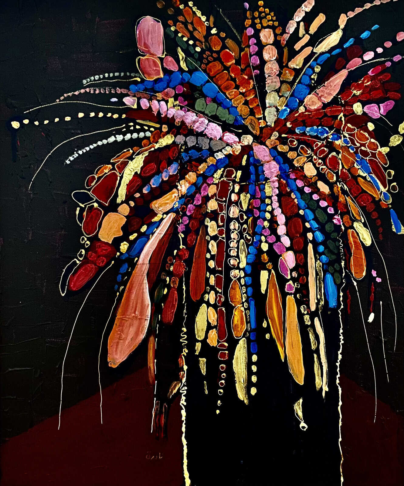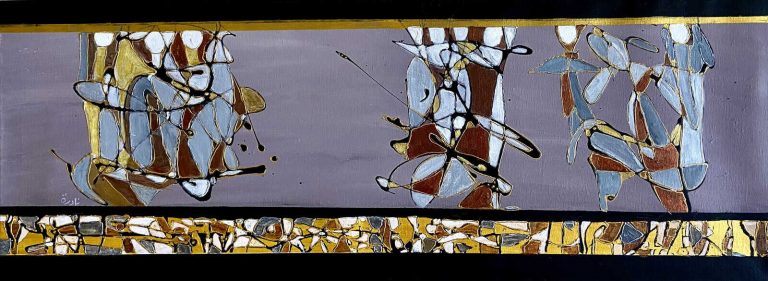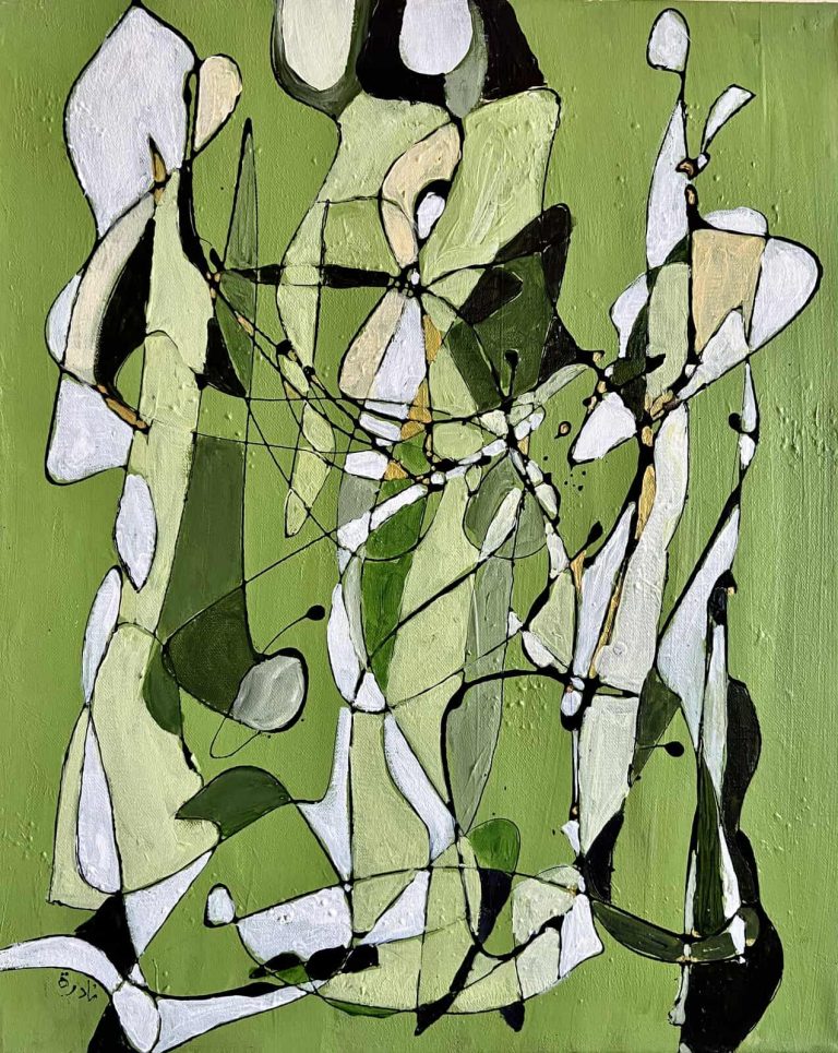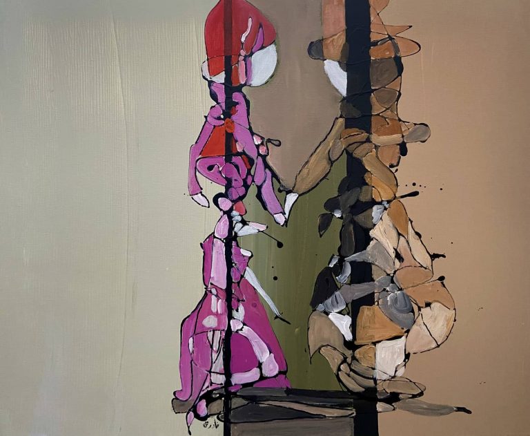 Azzouz’s works range from more realistic figural renderings to beautifully abstract lines and forms that hint at the presence of human forms while simultaneously weaving complex layered patterns and sinuous shapes. When we look at Azzouz’ paintings we feel the warmth and vibrancy of her subject matter. Azzouz’s mastery of colour and tone – whereby once applying rich jewel-like colours against dull earthy tones lends a feeling of magnificence to her work. The paintings utilise bold colours and transformations of abstract forms that project a sense of wonder and joy.