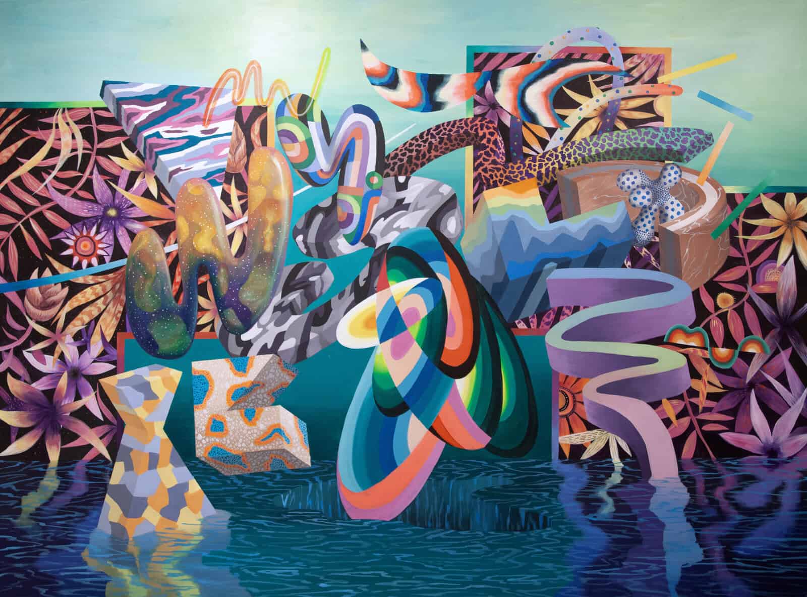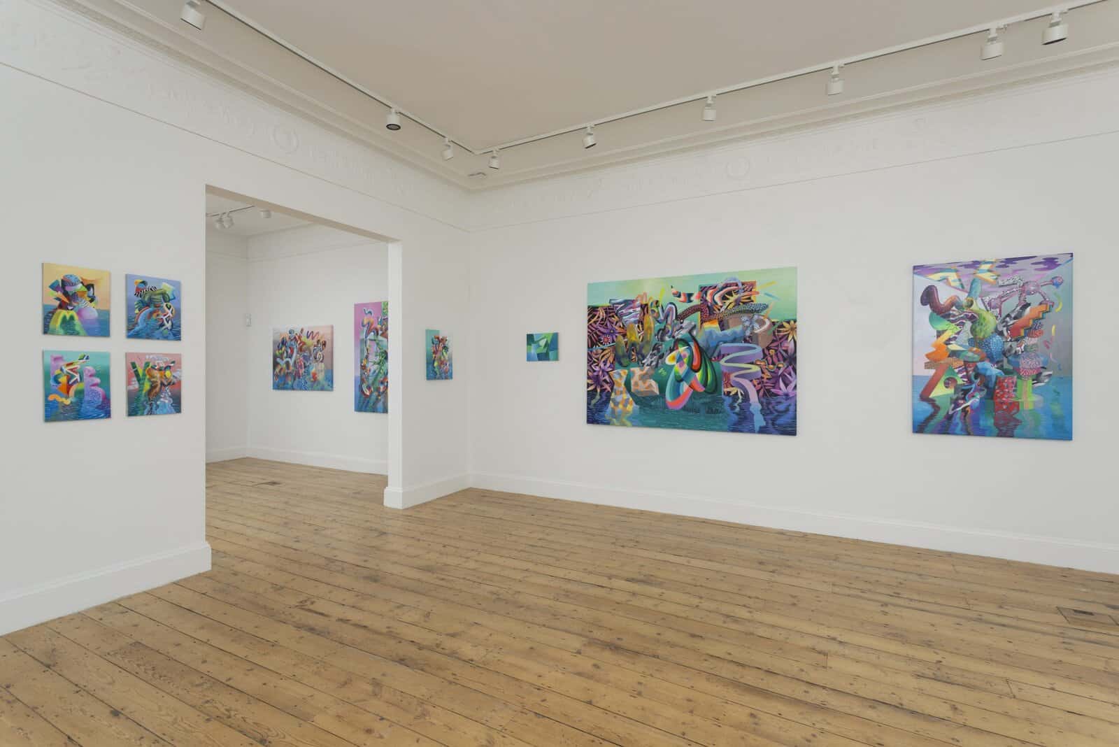 In this new series of paintings, each one numbered chronologically and titled Melting a False Monument 1-14 (with an additional 7 smaller works titled Small Moments 1-7) Mousawi’s canvases pile up tonally energetic forms within bombastic yet precarious compositions that jumble together to form surrealist landscapes. As such the sculptural objects within them read as false monuments, on the verge of collapse or perhaps melting into the calm ocean below. The compositions maintain some sort of architectural integrity, yet are abstracted just beyond the point of reality to a place where gravity and time do not exist. What feels like a stream of light moves through a block of marble, which flows into colour gradients of moving strips of plastic and so on. Â