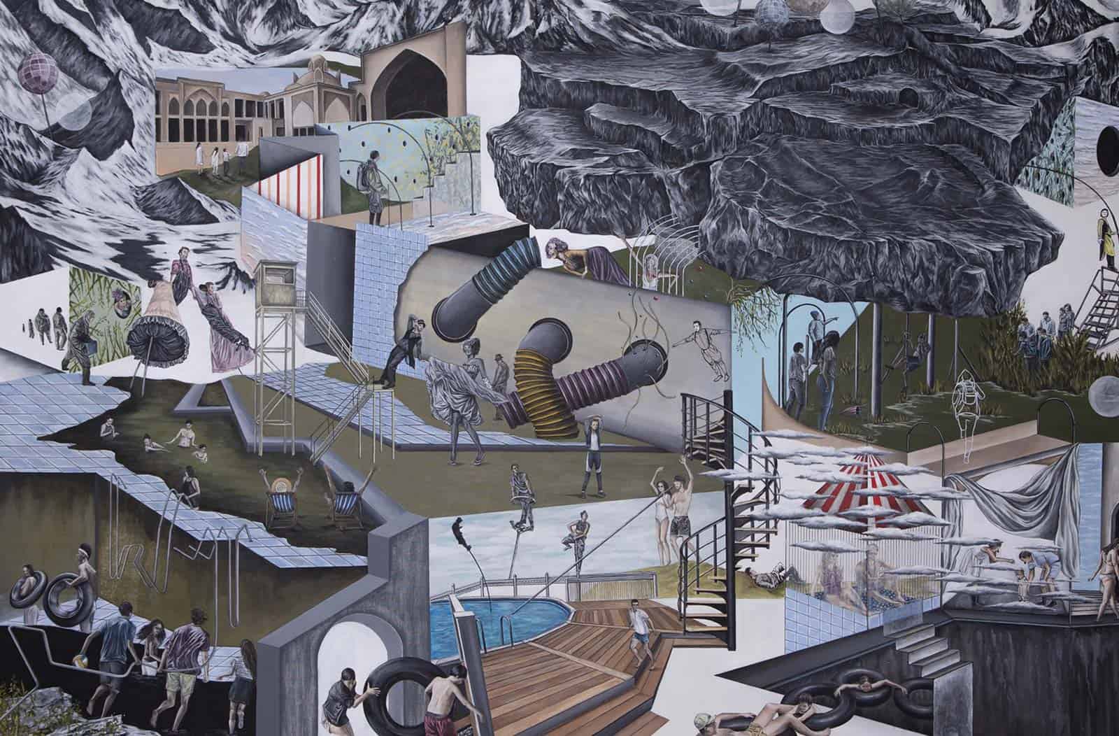 Where Abdolpanah’s art toys with the notion of art as a subconscious action, Misaghi too, questions the certainty of what we deem to be reality, and explains it is the recreation of reality in her subconscious imagination that creates her final work. In her consideration of the concept of the home, wider notions of identity, history, and geography are brought into Misaghi’s work. In a similar vein, Nazeri’s powerful paintings modernise Surrealism’s lawless aims through her use of bold colours and pared-down compositions that bring a hallucinatory quality of a dream into her joyous works. The combination of her subconscious thoughts and unconventional spaces lead the viewer to consider surprising new perspectives. Likewise, Amiryeganeh’s work plays with what she calls the entanglement of two voids; this idea of division and decomposition in which humans are an ever-changing object, “With an end unwritten in time and place.”