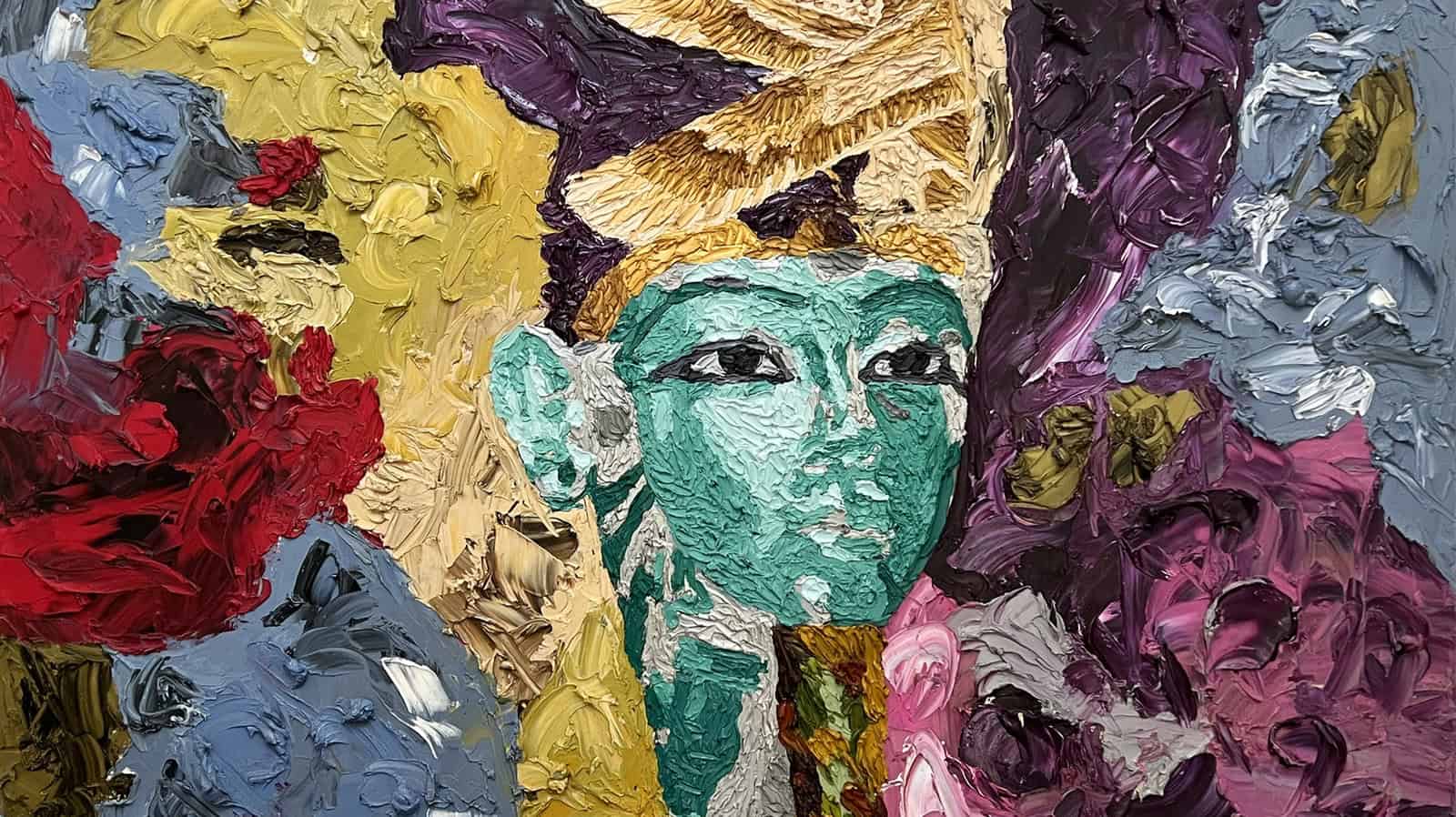 A prominent theme in Dirar’s canon is the Ancient Egyptian Queen Nefertiti. In the process of researching Nefertiti’s role within Ancient Egyptian society, Hossam Dirar discovered a wealth of symbols, stories and myths that come to represent the richness of her character in his works. Firmly rooted in the tradition of the icon, Dirar reinvents her style and fashion as a means by which he can connect her as a historical figure with the here and now, as a woman of today. By uncovering and referencing the elegance of Ancient Egyptian artwork in terms of fashion, Dirar presents Queen Nefertiti in an original yet contemporised style. By focusing on the details of Nefertiti’s crown and attire, Dirar puts into perspective the uniqueness of her character. The central focus on Ancient Egyptian women such as Queen Nefertiti or Cleopatra in his body of works speaks to his desire to highlight the role of women in society in the past and today. Drawn to the ancient history, language and culture of his homeland, Dirar aims to contemporise icons of Egyptian history in order to change cultural and societal attitudes today.