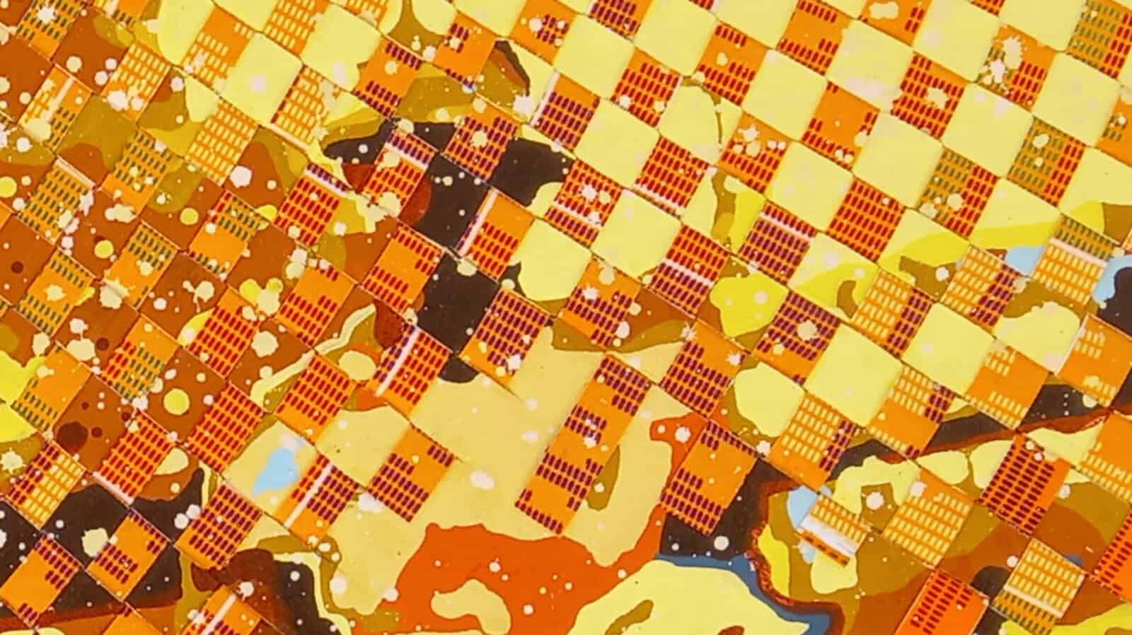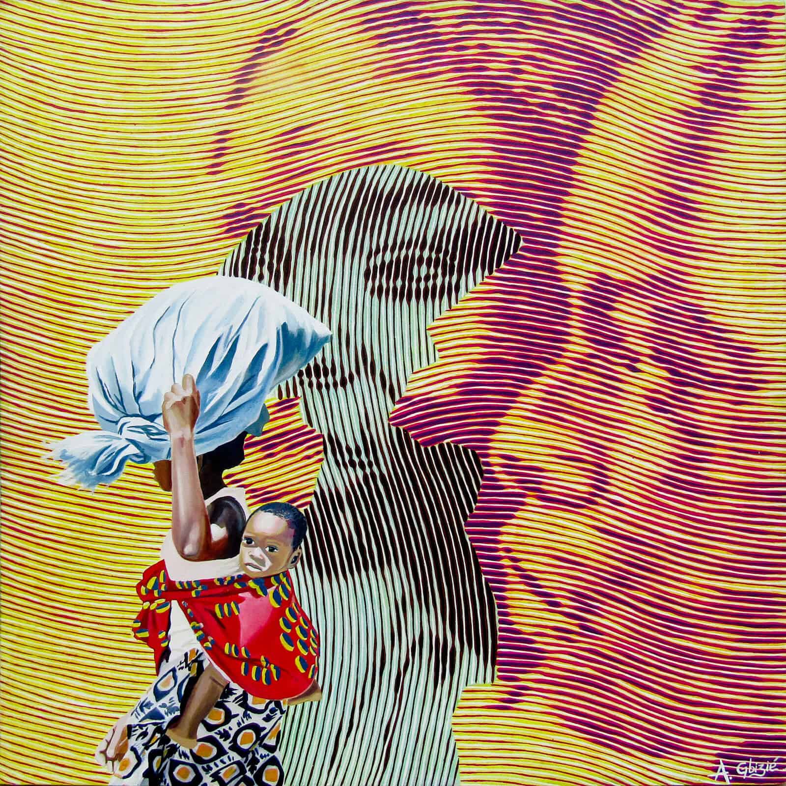 Likewise, Ivorian illustrator and painter, Alex Gbizié captures scenes from daily life. The inherent joyful nature of childhood is a central focus of Gbizié’s work, taking us back to our childhood memories. Pattern is a central feature of Gbizié’s body of work, with his backgrounds formed by alternating curved, straight, spiral and broken bands of colour that recreate the shapes and forms of young children. These lines, according to Gbizié, are representative of the paths that our dreams and intimate ambitions take. Like Asso, Muramuzi JohnBosco draws inspiration from the traditional technique of weaving by his mother that he witnessed in his childhood. From Sheema District, Uganda, JohnBosco’s artistic practice is informed by memories of the journeys taken from the village of Sheema to the streets of the Ugandan capital, Kampala, the places he has lived in, the experience of city life – the congestion and traffic jams, and the scenes of everyday life of an African city-dweller.