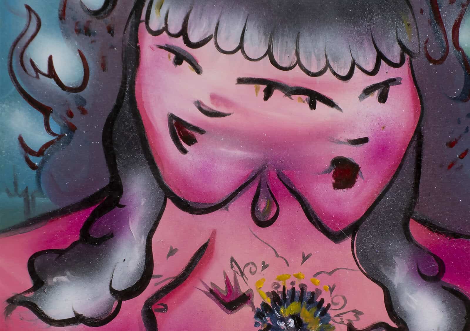 In this new series of works, the artist’s daydreams are of a blue palace and a sparkling, translucent sea. We are immersed in a glow of shimmering pinks and the blues of angels and fairies, nudes, cakes, swans and cats etc. Running through the works though are dark dystopian elements encompassing demonic figures and dragons with another canvas depicting menacing crows pecking at a woman’s chest, gushing with blood red droplets. Part fairy or folk tale / part nightmare with all their macabre subliminal undertones, Ahmadian’s paintings set a background for her female heroines – some tearful, some defiant, often standing in darkness or trapped within the limits of their own lives, but always strong and mindful of the future. After all, they are masters of their own destiny.