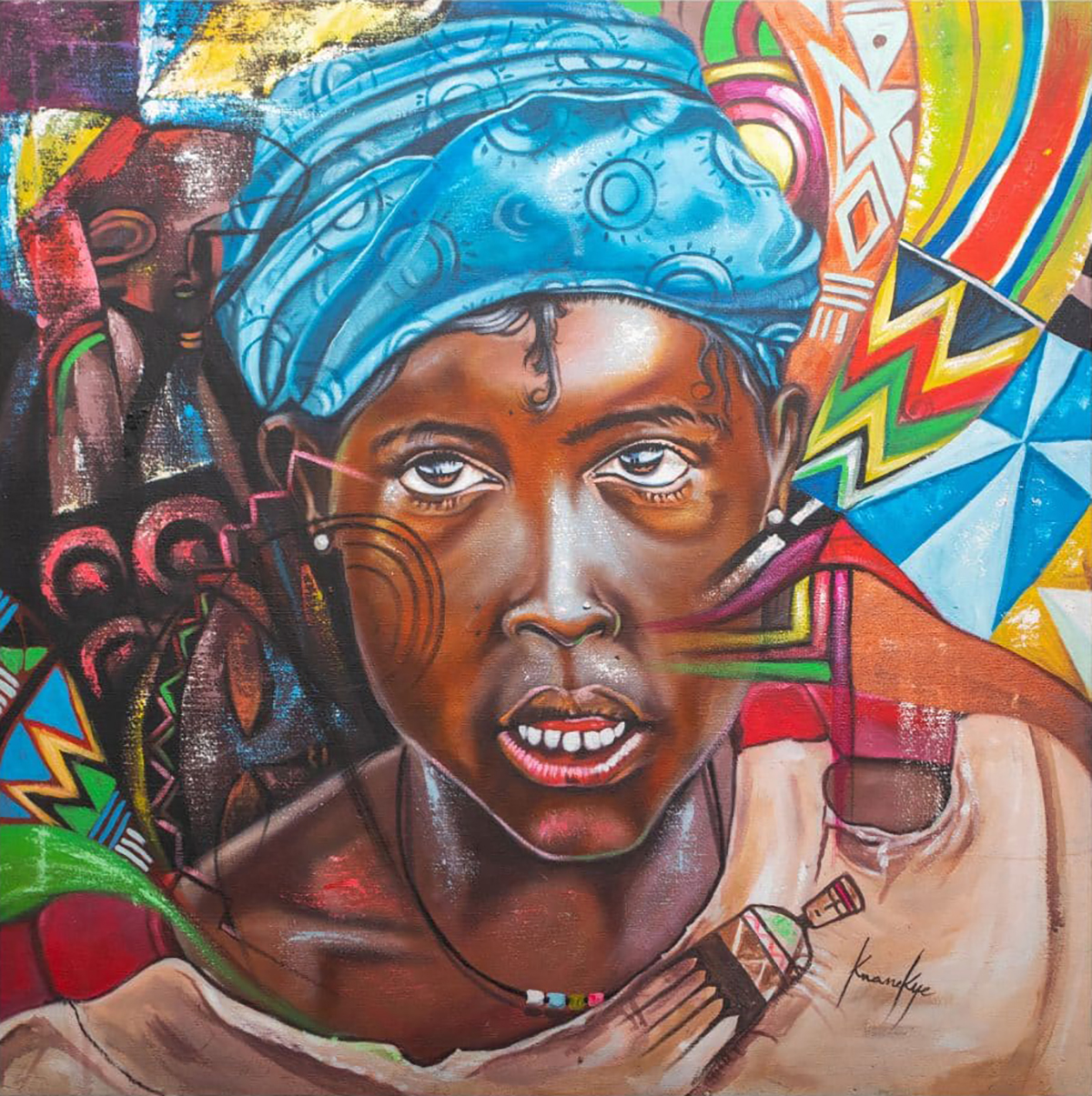 The latest portraits of Kye Quaicoe evolved from his much earlier engaging frenetic images with multi-coloured backgrounds and text. The eyes of his images even then were focused on the viewer.