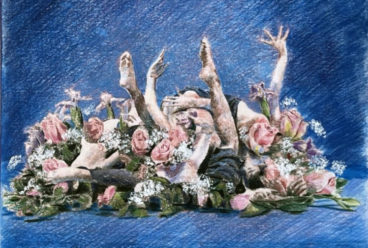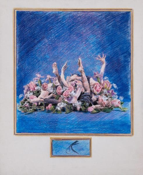 The works on paper quietly reflect the rage felt by Davoud at the war being waged against the rights of Iranian women. There are clear references made to protest and civil unrest in Davoud’s recent body of work, rewarded through close examination of the series “Immortal Flowers”.