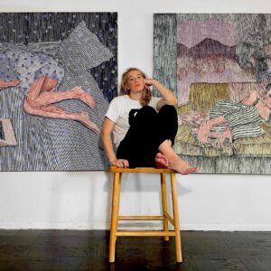 Brittany Miller’s practice centres on figurative painting, using line, repetition, and pattern to construct psychologically charged interior scenes. Her works often depict solitary figures within flattened, decorative spaces, where the boundary between environment and body becomes fluid, reflecting themes of introspection, isolation, and emotional tension.