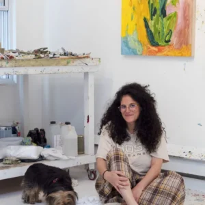 In Strawberry Still Life (2023), Rubenstein presents a playful yet dynamic composition in which familiar motifs—a strawberry, a glass vessel, and floral elements—are rendered with fluid brushwork and vibrant, shifting tones. The composition balances structure and spontaneity, allowing forms to dissolve and re-emerge across the surface. Through this painterly language, the work reflects the artist’s interest in perception, materiality, and the expressive potential of still life as a genre.